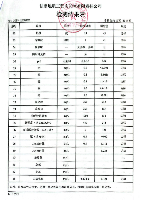 现将2025年第一季度生活饮用水水质检测信息公开如下:
