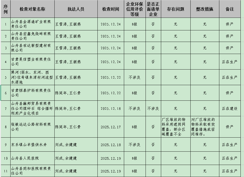 现将张掖市生态环境局山丹分局2025年12月份“双随机、一公开”现场检查情况公示如下: