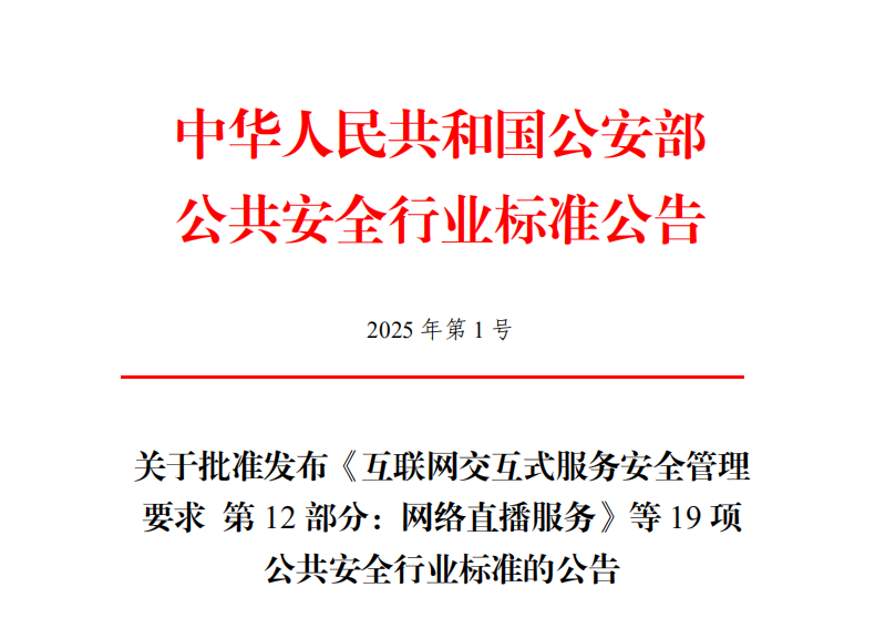 1 | GA 1277.12-2025 | 互联网交互式服务安全管理要求 第12部分:网络直播服务 | 无 | 2025.12.01 |