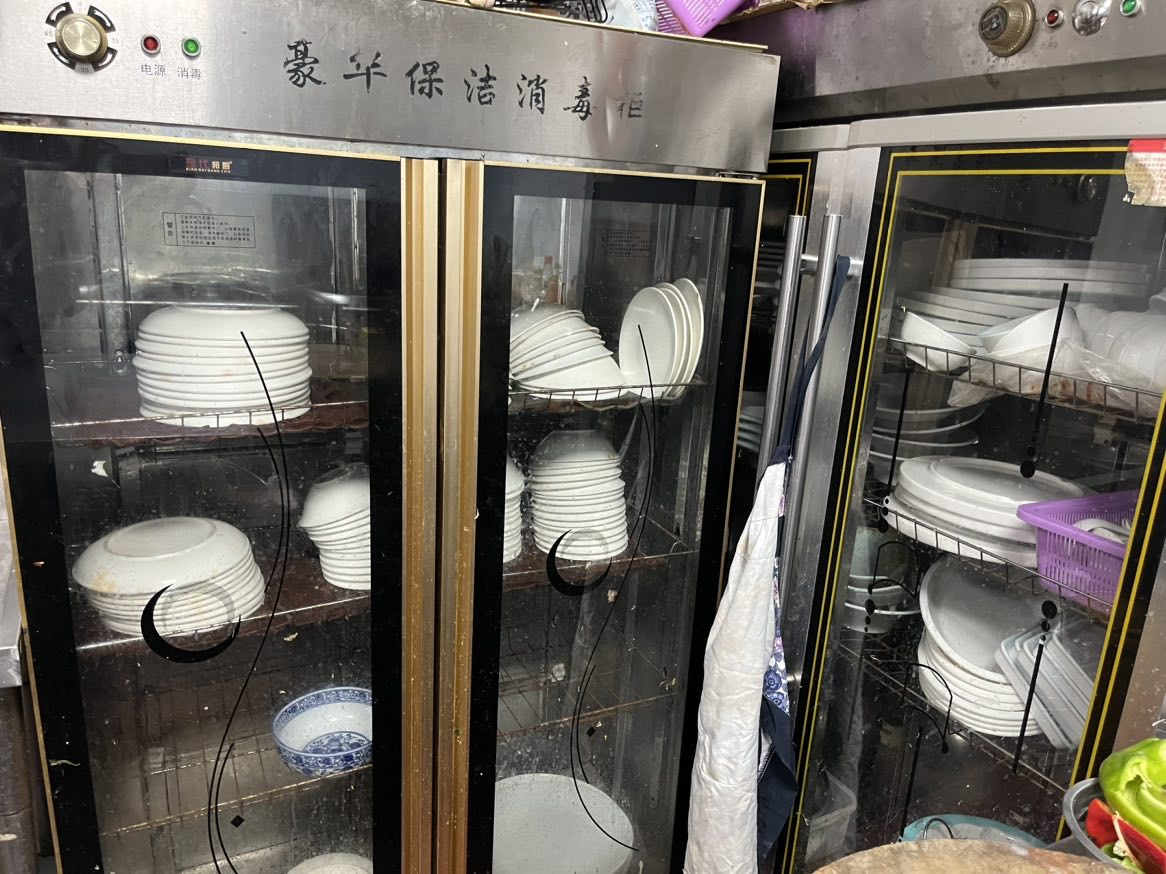 2.餐具消毒柜内餐具摆放不整齐、过于密集,操作台上用具摆放杂乱、调料盒无防蝇防尘措施。