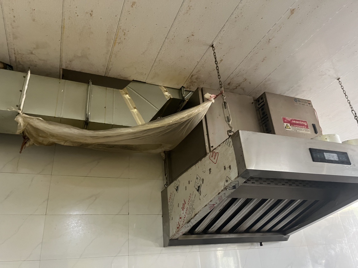 4.天花板有缝隙;油烟净化器油垢未及时清理,烟道有漏油现象。