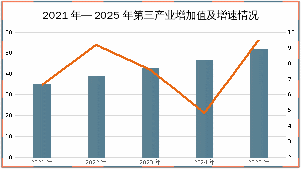 五年来,县委、县政府把加快服务业发展作为经济转型升级的战略支点,加快构建新发展格局,以创新激发服务消费内生动能,服务业对县域经济的贡献率不断提高。文旅融合深入推进,长城国家文化公园(山丹段)建设进展顺利,山丹马场、焉支山、艾黎纪念馆等景区接待游客人数逐年增长。商务服务、居民服务、文化体育、科学研究等行业规上服务业培育壮大。2025年,规上服务业营业收入2.12亿元,较“十三五”末增加0.46亿元,年均增长7.1%。2025年,营利性服务业增加值占三产比重20.8%,较“十三五”末提高8.3个百分点。第三产业增加值达到51.9亿元,较“十三五”末增加19.8亿元,年均增长7.5%。第三产业增加值对经济增长的贡献率达到61%,较“十三五”末提高48个百分点,成为拉动经济增长的重要力量。