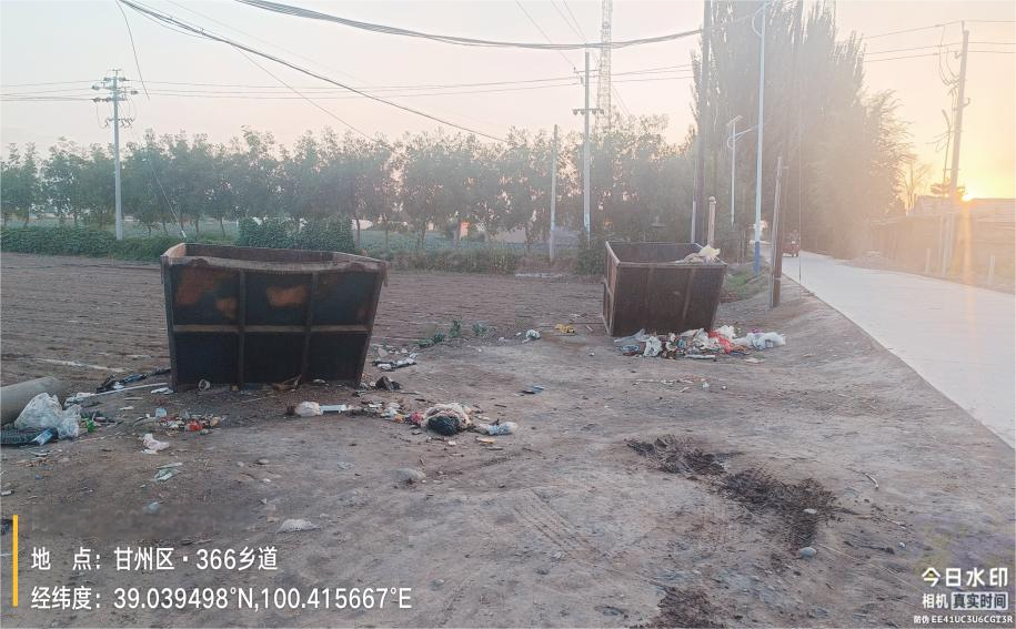 评价小组对甘州区评价区域境内涉及的5个乡镇19个行政村的城乡接合部、河沟渠道、村内庄外、背街小巷、田野地头、居民房前屋后等进行了实地踏勘,共计发现7处垃圾临时简易堆放点,其中乌江镇乌江村和靖安乡靖坪村问题点位居多。现场评价结果:甘州区各乡镇均根据当地实际情况投放了垃圾箱(斗),行政村配备了入户垃圾桶,但个别行政村存在垃圾不入箱造成的临时简易垃圾堆放点位,尤其是乌江镇镇政府附近的道路两侧,需加强日常保洁管理,加大宣传力度,积极引导群众养成垃圾入箱的良好生活习惯。