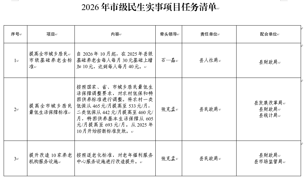 2026年,省级10件民生实事涉及我县9件,市级12件民生实事涉及我县10件,县十九届人大五次会议审议通过10件县级民生实事。为确保各项任务全面落实,根据《甘肃省人民政府办公厅关于印发2026年10件为民实事实施方案的通知》(甘政办发〔2026〕10号)和《张掖市人民政府办公室关于印发2026年市级民生实事实施方案的通知》(张政办发〔2026〕9号)要求,县直相关部门结合我县实际制定了2026年民生实事实施方案,经县政府同意,现印发你们,请认真组织实施。