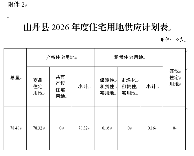 2026年度本县住宅用地计划供应78.48公顷,其中产权住宅用地78.32公顷(商品住宅用地78.32公顷),租赁住宅用地0.16公顷。