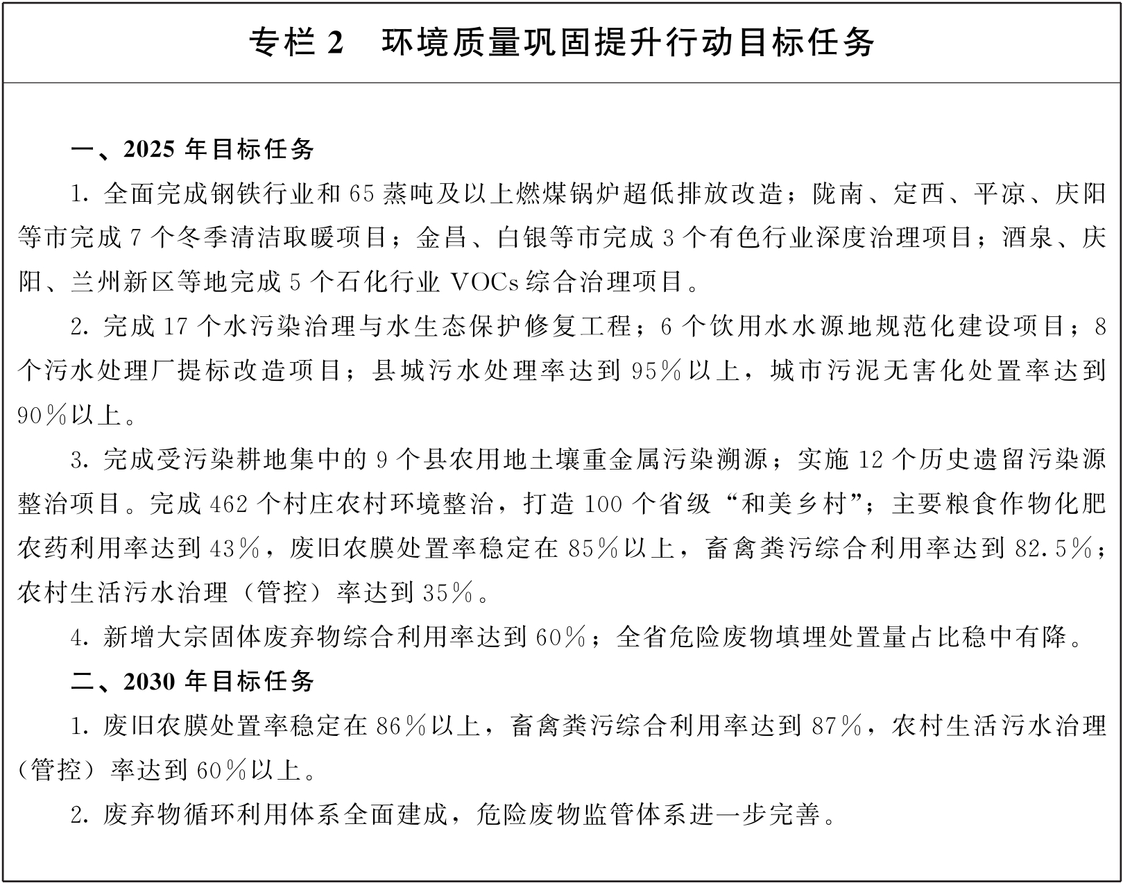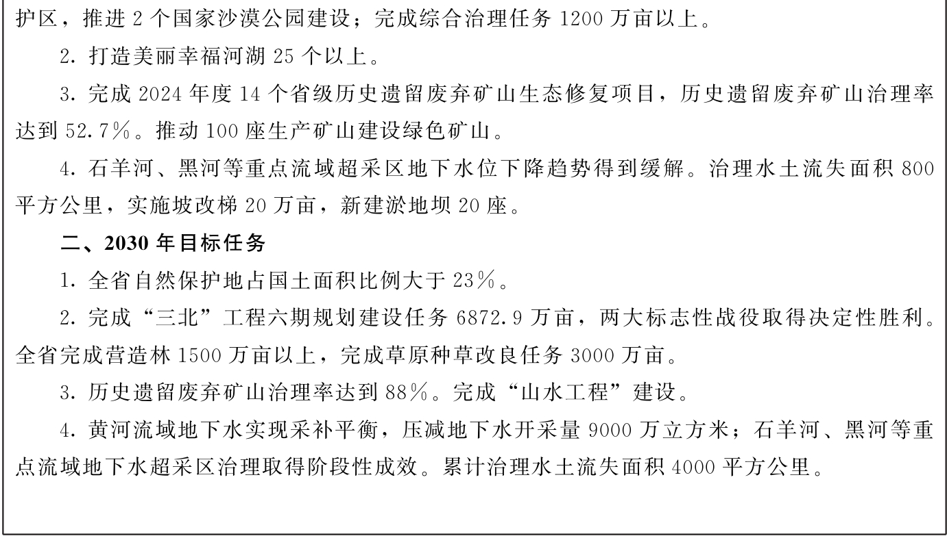 到2030年底,国家西部生态安全屏障更加牢固。森林覆盖率提高至12.7%,森林蓄积量提高至3.3亿立方米,草原综合植被盖度达到53.5%,湿地保护率达到54.35%,水土保持率达到64.14%,可治理沙化土地治理率达到67%;城市空气质量优良天数比率达到94%,地表水达到或好于Ⅲ类水体的比例达到95%左右,黄河干流水质稳定保持在Ⅱ类及以上;受污染耕地安全利用率达到98%;单位地区生产总值二氧化碳排放比2005年下降65%以上。
