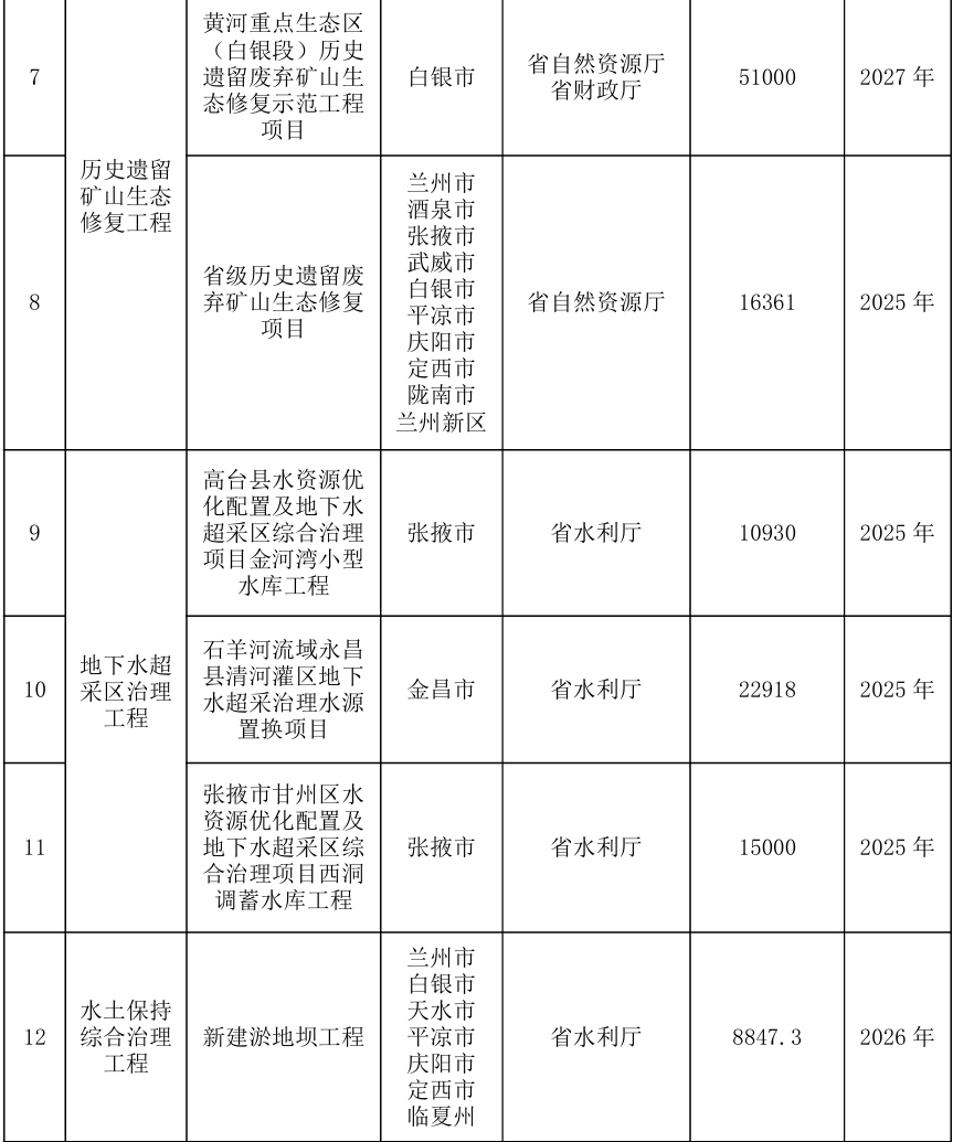 (六)实施历史遗留矿山生态修复工程。全面完成历史遗留废弃矿山生态破坏调查评价,建立全省数据库。实施平凉、白银等历史遗留废弃矿山生态修复示范工程。以黄河重点生态区、长江重点生态区、北方防沙带为重点,谋划开展历史遗留废弃矿山生态修复示范工程。积极引导和支持矿山企业走绿色发展之路。(责任单位:省自然资源厅、省生态环境厅)